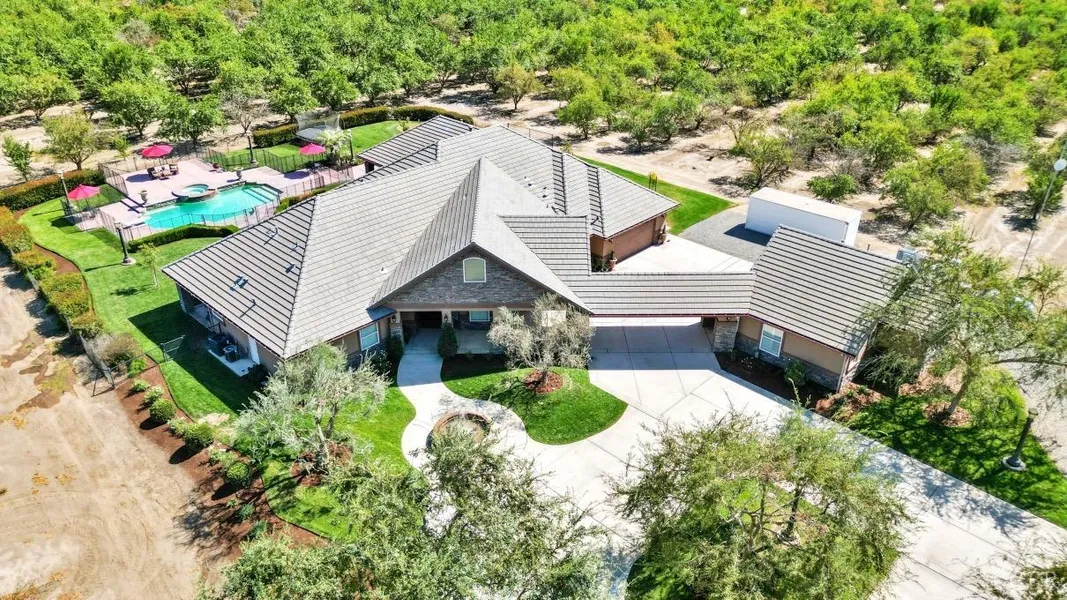 Elevated luxury living nestled within 68 acres of almond trees! This custom home showcases quality, warmth, & relaxation, all unfolding in a serene setting with every comfort & amenity. Exceptional construction, high-end finishes, fixtures, & incredible attention to detail show throughout the split floor plan with an attached, yet secluded, separate guest quarters. Shutters adorn every window for pristine perfection and surround sound is wired throughout the main house. The family room is timeless in design with a cozy fireplace with a built-in blower filling the space with warmth. The built-ins offer a focal point to display your most cherished decor. The graceful estate's kitchen is filled with elegance and timeless architectural detail with a large island equipped with a prep sink, double drawer dishwasher, two full ovens, a gas five-burner stove top with a griddle, and a pot filler. The side-by-side built in refrigerator and freezer with a separate pellet ice maker, coffee bar, and walk in pantry complete this dream kitchen. The kitchen bar comfortably allows seating for six in addition to the breakfast nook. The Dining room is designed to host a proper formal dining experience in the large open space with a built-in hutch and nearby powder room. The office allows you to work while remaining in the comfort of your home. The primary suite is grand yet intimate. The two walk-in closets feature custom shelving with pull down wardrobe lifts and built ins. The stunning bathroom has a separate soaking tub, walk in shower with multiple shower heads, and his and hers sinks. French doors give the primary private access to the captivating backyard. Two oversized guest bedrooms are conveniently adjoined by a Jack and Jill bathroom while having their own walk-in closets and private vanity areas. The additional guest quarters is thoughtfully designed with a private bathroom and walk-in closet. This dignified estate is perfect for those who love to entertain! The game room with a built-in bar includes an under the counter ice maker, refrigerator, wine cooler and half bath. A large covered patio connecting to the outside of the game room offers an array of seating areas and a built-in fire pit. Take advantage of relaxing in the large swimming pool and hot tub and stay active with the personal putting green and trampoline. The breathtaking grounds also have a fenced in area to accommodate small animals or be used as a dog run. The 4 separate A/C units cools the home offering zone control in the main house. The newer 400 ft deep well provides water to the home while the separate 180 ft deep well is intended for landscaping. Protect this coveted property with the security system including cameras and an alarm. The acreage includes a brand new 600 ft deep irrigation well and water rights to People's Ditch for the almond trees to flourish. This exemplary property is a rare find!