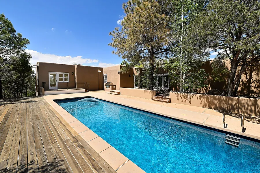 On a quiet wooded acre on a distinguished Eastside street near Museum Hill and Canyon Road, this meticulously renovated home combines Santa Fe style with contemporary sophistication. Brick, tile and hardwood floors, plaster walls, painted vigas, corner fireplaces, skylights, and plentiful windows and glass doors contribute to a singular style and an airy, light-infused ambience. Open public spaces encourage entertaining and make day-to-day living effortless. Each of the four bedrooms enjoys an en-suite bath and a well-outfitted closet. Enveloping the home are a colorful courtyard, multiple decks, and a terrace surrounding a pool.