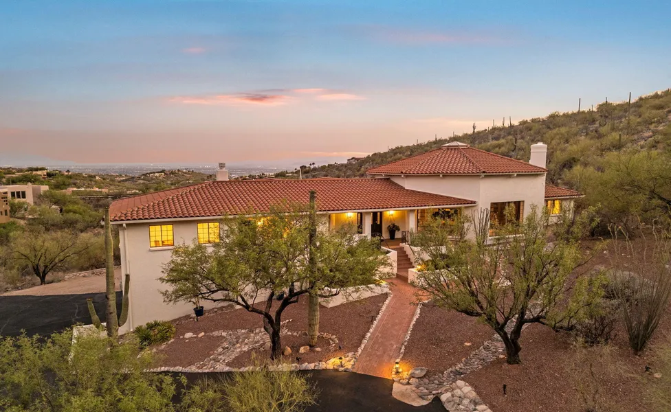Welcome to Villa Puesta del Sol, a timeless residence of understated elegance nestled in the prestigious, guard-gated community of Finisterra on a private 2+acre view lot. Designed and built by renowned Tucson builder Mike Wachs, this exceptional home blends classic craftsmanship with luxurious modern upgrades, breathtaking city & Catalina Mountain views and embodies the sought-after Catalina Foothills Lifestyle. As you approach, the long private tree lined driveway will lead you to the front entry, beautifully landscaped with the Catalina Mountains towering above and at your fingertips. Enter through the hand carved front door to a grand living room that was designed for entertaining and definitely has a ''Wow'' factor. Walls of custom bookcases frame the beautiful wood burning fireplace. A wood clad 20' high ceiling adds warmth to the enormous room while a large picture window brings nature in. A custom walk-up wine bar on the other side of the living room is guaranteed to make holidays and special occasions with family so much more enjoyable. At the heart of the home is a spectacular $200,000+ custom kitchen curated by Dorado Designs, Tucson's premier kitchen design firm. Outfitted with top-of-the-line commercial grade Wolf, Viking, and Sub-Zero appliances, this culinary space balances form and function with abundant integrated storage, refined finishes, and commanding city views from the kitchen sink. The adjacent formal and casual dining areas overlook the dramatic city skyline and backyard. The luxurious primary bedroom suite is larger than some starter homes and features an enormous walk-in closet big enough to share with your partner or spouse, a spa like bathroom w/steam shower & Jacuzzi tub, double vanities, a private rear patio with impressive city views, and an adjacent home office with private entrance. The split bedroom floorplan is ideal with three en-suite bedrooms all with new carpet & updated bathrooms, a large powder room & a bonus rec room at the end of the hall with pocket doors to hide toys from sight or block the sound of little angels fighting. Downstairs, you will find a car enthusiast dream garage large enough for 4 -6 cars or a small RV or boat. Also downstairs, is a climate-controlled flex space, ideal for a wine cellar, workshop, storage, recording studio or gym. The backyard is a blank canvas, ready to accommodate a pool, sport court, gardens, or outdoor entertaining spaces tailored to your lifestyle. This solid masonry home has been meticulously maintained and thoughtfully updated recently with a new tile roof (2024), 4 newer heat pumps (2023-2025), fresh interior and exterior paint (2025), new carpeting (2025), and a newly paved driveway (2025). Don't miss this rare opportunity to own one of Finisterra's finest properties, where luxury, location, and lifestyle converge. Residents of Finisterra enjoy exclusive access to community amenities including a heated Olympic lap pool, tennis and pickleball courts, clubhouse for private events, and 24/7 guarded gate access. Ventana Canyon Country Club & Lowes Ventana Canyon Resort are a short 5 min drive away and offer golf, tennis, social & spa memberships