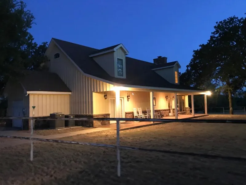 This ranch is an amazing 687+- acres with custom two story home in northern Brown County. The home is nestled in the large post oak trees, with porches front and back, and pipe yard fence. It offers 3 bed rooms and two bathrooms downstairs and a large bedroom with combined living/sitting area upstairs along with a full bath. Downstairs the massive rock fireplace extends from floor to extended ceiling and is the focal point of the home offering warmth and comfort. The kitchen, living, and dining area is open concept centered around the fireplace. Large windows throughout the home give views across the ranch and allow for natural lighting. Flooring is stained concrete for ease of cleaning.