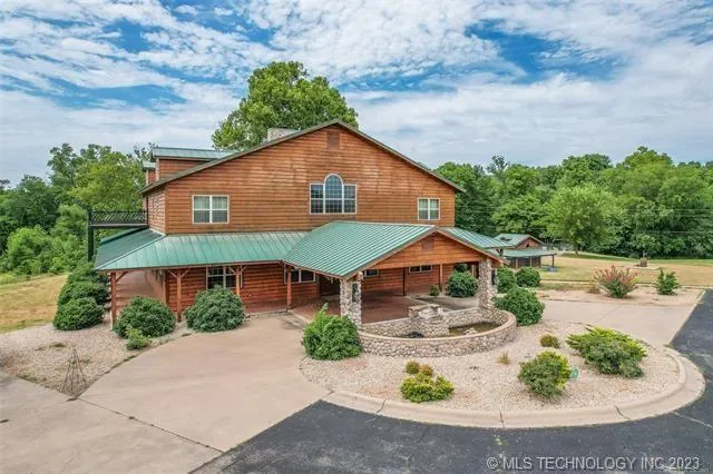 Rare find!! Grand Lake luxurious log, Over 1,320 ft river front, 69.3 acres, 6,800 sf log home, 6 BR, 4.5 BA, main BR huge w/balcony overlooking ranch and beautiful in ground pool, enjoy fishing in the stocked pond, this house has large covered patio built-in outdoor cooker, lg kitchen w/3 ovens & wooden bar, propane cooktop-GREAT KITCHEN! Double fireplace, saferoom, gameroom w/pool table, incredible dining room table, could be venue/B&B, furnished, unique remodeled barn w/6 stalls & sleeping area+bath, lg barn for storage, gated & pipe fencing. Lastly licensed to grow cannabis! All furniture included with the price!