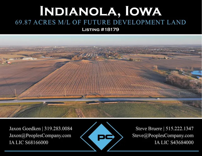Located off the major arterial road, County Road R63 and N Y Street, the farm is situated in an ideal area for future development. Approximately 16 acres m/l of the west side of the farm have been annexed into the Indianola Corporate Limits, and the rest of the farm has been identified as high priority for future annexation. The farm is currently zoned Agriculture, but Indianola has slated the farm for Low-Density Residential in their 2030 Comprehensive Plan. Water and sewer are ...