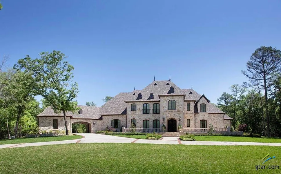 Custom-designed & built masterpiece, built in 2015 w/amazing quality features, extensive millwork & built-ins throughout. The solid Granbury Stone exterior, lge Sandstone cov'd front porch, mansard roof line, copper finials, gutters, downpipes & dormer windows are all distinctive of this French manor home. Wide tree-lined driveway leads to impressive gated entry w/stone columns, wrought iron gate & fencing. Secluded from main roads view by dense thicket of trees; so peaceful & quiet! Emerging from the woods, one sees the 2-story stately home w/scored concrete circular driveway. Magnificent estate-type home; meticulous attention to every detail. Features 3 living areas, including study, + media rm, complete w/kitchenette. A grand entry hall, accented by winding custom wrought iron staircase, opens to the formal dining room & formal living room. Kitchen w/island, prep sink, Sub-Zero refrigerator, icemaker, 2 dishwashers, 3 ovens including Wolf range/oven, granite countertops & vent-a-hood of hand-painted cast stone. Separate room off kitchen w/extensive custom cabinetry for storage & lge pantry; includes a baking center with out-of-site storage for small appliances. Separate butlers pantry w/Sonic icemaker, sink, coffee station, china/crystal cabinets & custom-designed wine room. Lge outdoor living & dining area w/stone fireplace, TV over mantle, complete kitchen including SS grill, refrigerator, icemaker & DW, full tile bath & heated gunite pool/spa w/water features. Custom wrought iron backyard fencing. Adjoining covered porch spans back of home; great entertaining area! Concrete drive leads to separate 40X60 shop w/guest house/office featuring workout area, full bath, kitchenette w/antique bar & cabinets; stairs to add'l storage. On apx. 70 heavily wooded acres; just minutes to Tyler shopping & mediical facilities; across the road from Lk. Tyler with public boat ramp & private docks just minutes away. Buyer could subdivide acreage into smaller tracts & sell.