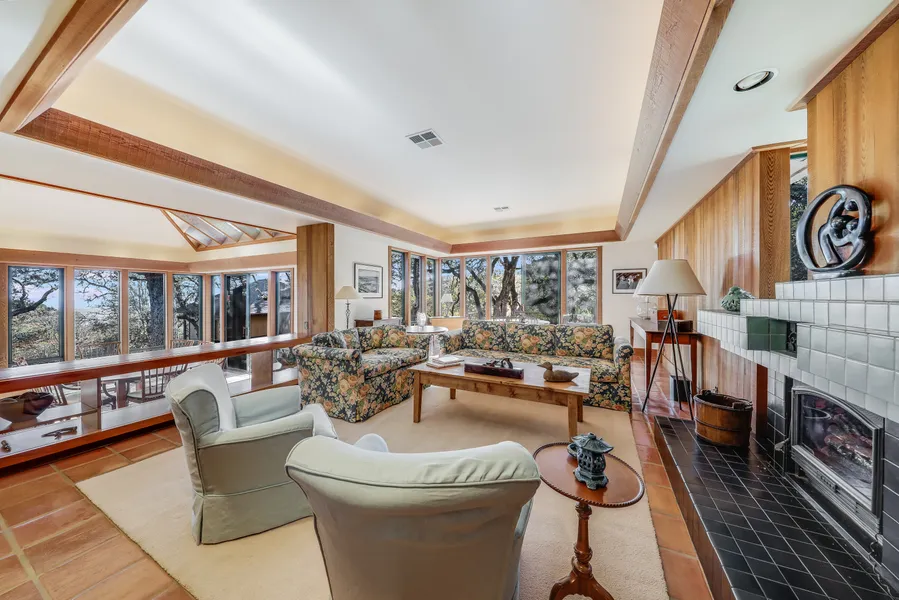 The property consists of five separate buildings with the main house as the centerpiece. Down a short, tree-lined country drive you'll find an oversized garage and separate spacious woodshop. Sculpted stone walkways lead to the home below nestled perfectly among the oak trees taking full advantage of the natural contours of the 7 acre parcel. The multi-level main home boasts of 2 living rooms with fireplaces, 3 dining areas, formal library, well-appointed office nook, a great room kitchen with huge island, 2 spacious on suites bedrooms all featuring incredible light and sliders to the wrap-around wood decks and stone patios.