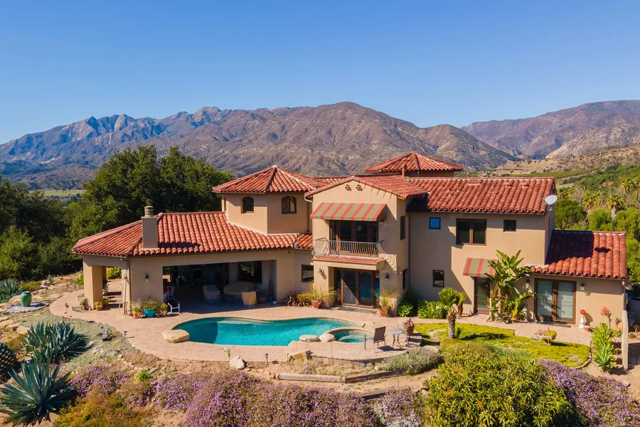 This Marc Whitman design sits on two separate lots equals approximately 7.27 acres with fantastic views and offers upscale country living minutes from the cafes, shops, galleries, and farmers market in downtown Ojai. The first- and second-floor master suites allow you to choose which will be your private retreat and which will provide a comfortable stay for guests.Third floor is office could be converted to 3rd bedroom. the kitchen, cooks will love the Wolf range, warming drawer, over-sized island with breakfast bar, walk-in pantry, butler's pantry, built-in desk, and beautiful views of the pool, valley, and mountains. Other interior features include vaulted ceilings, four fireplaces, jetted soaking tub, large closets, and versatile spaces. Outside, a gorgeous outdoor living area offers a pool, outdoor kitchen, and patio fireplace. There is also a separate garden area, Solar for the hous...