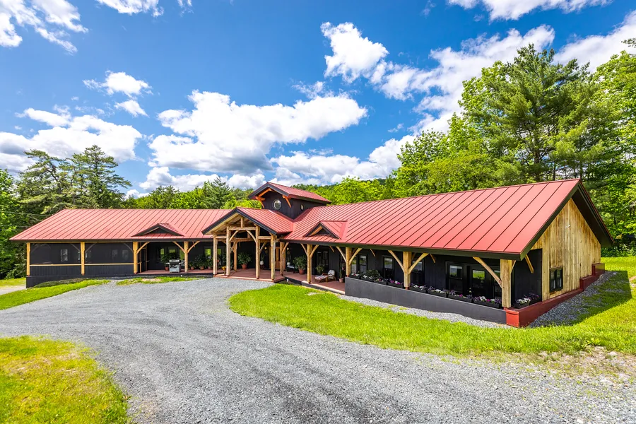 Architecture as Art: This grand post-and-beam home - with 23-ft ceilings, cupola, spacious rooms, tranquil light – on 7 acres near the sweet town of South Royalton was erected in 2007 as a commercial structure and repurposed in 2022 as an exquisite home. The Great Room/entry is the centerpiece of a coherent design, with common spaces in the west wing and three private bedrooms in the east wing. A covered porch along the front allows flow from inside to out. Light pours in from three directions all day in one expansive, open, shimmering kitchen/dining/sitting room/screened porch; pantry, media room, half bath complete the west wing. To the east: large laundry, two guest bedrooms with shared bath, and an expansive primary bedroom/ensuite bath with steam shower. A creek borders the north edge of the property. The house is a fortress of calm and light, with SIPS panels and radiant floor heat...