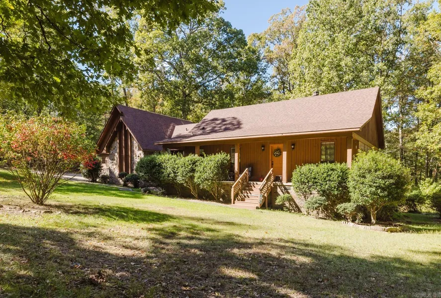 Nestled on 7 private wooded acres, this 3-bedroom, 2-bath home offers peaceful country living with timeless character and endless potential. The spacious living room features vaulted ceilings, exposed beams, and a cozy brick fireplace, creating a warm and inviting gathering space. Enjoy a separate formal dining room, large windows overlooking the trees, and a functional kitchen ready for your personal updates. The oversized primary suite includes a double vanity, soaking tub, and walk-in shower, while the large deck provides the perfect spot to relax and enjoy the serene surroundings. Property also includes a basement workshop/garage space, ideal for hobbies or storage and the crawl space has been professionally encapsulated for added peace of mind. A rare opportunity to own acreage with privacy, space, and room to make it your own. Home to be sold as-is.