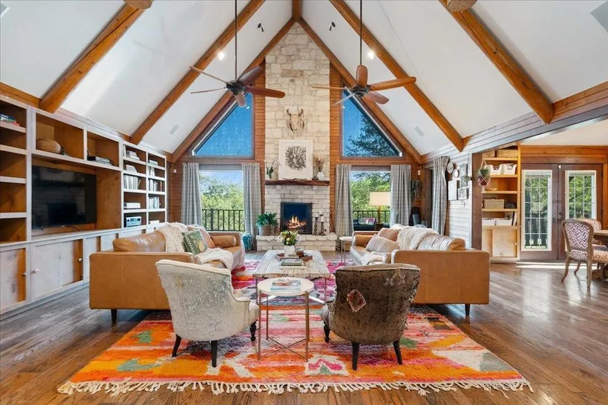If you ve dreamed of the perfect Texas Hill Country property, look no further! This 2740 sf log cabin with luxurious details sits on over 7 oak-dotted acres in northwest Travis County, only minutes from shopping and restaurants in Lago Vista, Jonestown, and Cedar Park. Downtown Austin is less than an hour away, but when you drive through the gate and down the winding drive, you get the sense of peace, privacy, and serenity you feel when far away from everything. Inside, the open floor plan is bright and welcoming, centered around a stone fireplace that anchors the heart of the home. The large entertainer s kitchen hosts all of your family and friends, and built in shelves throughout the home line the walls with stories and treasures. Retreat to the first floor primary suite with its en-suite bath, double vanity, his and hers walk-in closets and claw foot tub. Throw open the French doors...