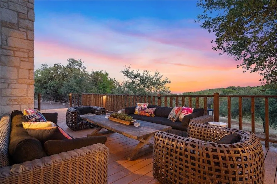 Welcome to Texas Hill Country living! No HOA, city taxes, or MUD! This 3-bedroom, 2.5-bath log home with the green metal roof sits on nearly 8 oak-filled acres with winding trails. It features a custom stone gated entry and is completely fenced for added privacy. From the wrap-around porch, step inside to find a sunlit, open-concept living room with a vaulted beamed ceiling, stone fireplace, and built-in bookshelves. The spacious kitchen flows into the dining area and out to a large deck overlooking the property, perfect for welcoming the day or enjoying the stars at night. The first-floor primary suite includes a bathroom with his-and-her closets, a clawfoot soaking tub, separate shower, and another set of French doors leading to the deck and garden views. Upstairs you'll find two spacious bedrooms at each end of an open hallway overlooking the living room, and an enclosed loft with vintage windows - the perfect office or art studio space. Back downstairs, a large laundry room with sink and extra storage makes a great mudroom after gardening or hiking through the woods. Outside, the rolling terrain makes the property feel even larger than it is, offering space to add on and still enjoy roaming the back woods. The huge barn features enormous sliding doors, a separate enclosed and air-conditioned office or studio, and lots of extra storage space. So many possibilities! Whether you want to utilize the existing animal structures and garden and start your own dream farm, or use the space to create a dream resort-style pool and cabana, this property is just waiting to be your private escape. Perfect for full time living, private retreat, or short term rental. Although it feels miles away from anything, you re actually just 5 minutes from Lago Vista, 20 minutes from Cedar Park, and 40 minutes from downtown Austin. Access to Lake Travis is right in Jonestown.