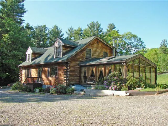 This horse property offers a lot for the money. Located in the Southern/Central part of New Hampshire within a few miles of Massachusetts border. Quaint New England town with nearby lakes. This property is privately set on 7.4 acres. The log home was built in 1979 and offers generous sized rooms including three bedrooms on the 2nd floor, two full baths, 1st floor office/den, separate dining room, 20x20 4-season sunroom/family room with woodstove & hot tub. Outside you'll find an inviting 20x40 kidney shaped IG-pool, big 4+ stall barn & numerous large fenced turnouts. The circular driveway has an extension that leads to the barn, providing easy access to unload hay, etc. The barn has a stairway to full loft, 12x12 stalls and direct turnout. Plenty of open pasture and turnouts.