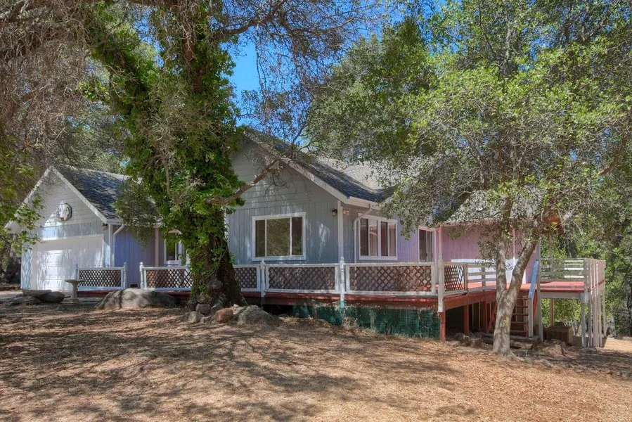 Custom built home with so much country charm! This 3 bedroom, 2 bath home is ready and waiting for you to call it home! The front deck wraps around to the back giving you lovely views and a large space for outdoor entertaining! Enjoy the open floor plan with spacious living room, dining area with lovely tiled fireplace and built-in entertainment center and easy flow to the kitchen. All with tongue 'n groove pine ceilings. The kitchen is ready for your next family get-together with lots of tiled counter space and cabinets and a walk-in pantry. Nice sized bedrooms with a large master bedroom. The master bedroom and the first bedroom offers sliding glass doors out to the deck. The master bedroom also has a huge walk-in closet and a great bathroom with separate shower and bathtub with a sit down vanity area. The covered and uncovered deck is a great place to relax and enjoy the views of this 7.4+/- beautiful acres! There is a fantastic under the home storage area! It's a giant space you could use for lots of things! This home also has a garden shed, 2 car attached garage with laundry area, concrete driveway and stunning Oak trees!