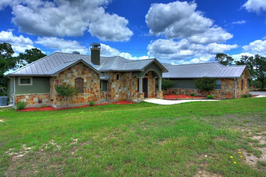 Texas-size panoramic views from the stone & stucco custom design home w/standing seam metal roof making it a genuine Hill Country tradition.The floor plan is spacious & opens to all living areas...perfect for entertaining & flow.Wood flooring thru-out the living areas including the master & office.Coffered ceiling & stone fireplace in living.Stepped-up ceiling w/chandelier in dining.Kitchen offers island w/pendant lighting,eating bar & stainless sink,stainless appliances,granite countertops,& wood cabinetry/vent hood.Master features a stepped-up ceiling, fan/light & spot fixtures,& tri-window set.Thru double doors enter M-bath which includes his/her dressing/lavatory areas,wood cabinetry,granite countertops,claw footed tub & shower.Airy loggia w/fireplace & automatic screening.Oak groves.
