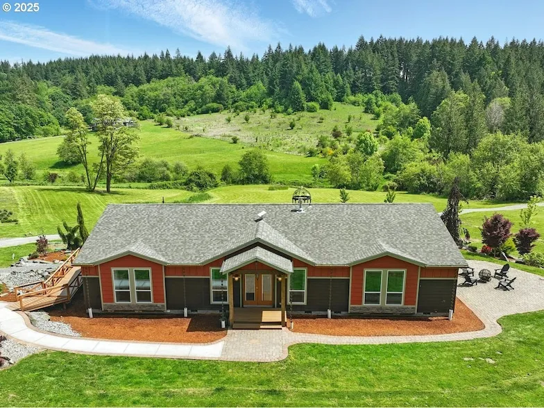 This stunning 5-bedroom, 3-bath estate is nestled on 7.5 private acres and backs up to United States Forest Service land, offering the perfect blend of seclusion, natural beauty, and elegant country living. As you arrive, you re welcomed by a row of 40-year-old Sequoias, blooming lavender fields, and a charming French garden. Jenny Creek meanders through the back of the property, adding to the peaceful, park-like setting. The newly built French Victorian conservatory and gazebo provide beautiful outdoor spaces for entertaining or quiet reflection. Inside, the home is filled with light from oversized windows that capture expansive territorial views. Coffered ceilings, crown molding, and engineered hardwood floors add timeless sophistication. The spacious kitchen is a chef s dream, featuring granite counters, a 5-burner propane range, and a generous walk-in pantry. Smart home features throughout and ADA-compliant entryways, doors, and halls ensure daily life is both efficient and accessible. Smart irrigation keeps the landscape vibrant year-round. A spacious 3-car garage, barn, and shop offer ample storage and flexibility for hobbies, animals, or equipment. A second well and separate septic system near the barn provide additional utility and expansion potential. This rare property offers refined comfort, natural beauty, and room to thrive.