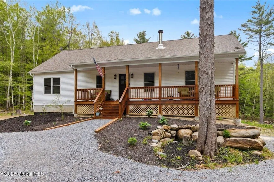 Private Adirondack Escape on over 7 acres! This 2021 single-story home offers a perfect mix of comfort, space, and charm. The open floor plan features natural finishes, hickory cabinets, a farmhouse apron sink, large center island, and a pot filler over the stove ideal for both daily living and entertaining. The spacious great room brings in plenty of natural light. A front porch welcomes morning coffee, while the finished basement with egress adds extra living space, storage, and an oversized two-car garage. Surrounded by mature trees and natural landscaping, this private retreat is less than a mile from Jenny Lake and Hunt Lake, and under 30 minutes to Saratoga Springs and Lake George. See docs for upgrades.