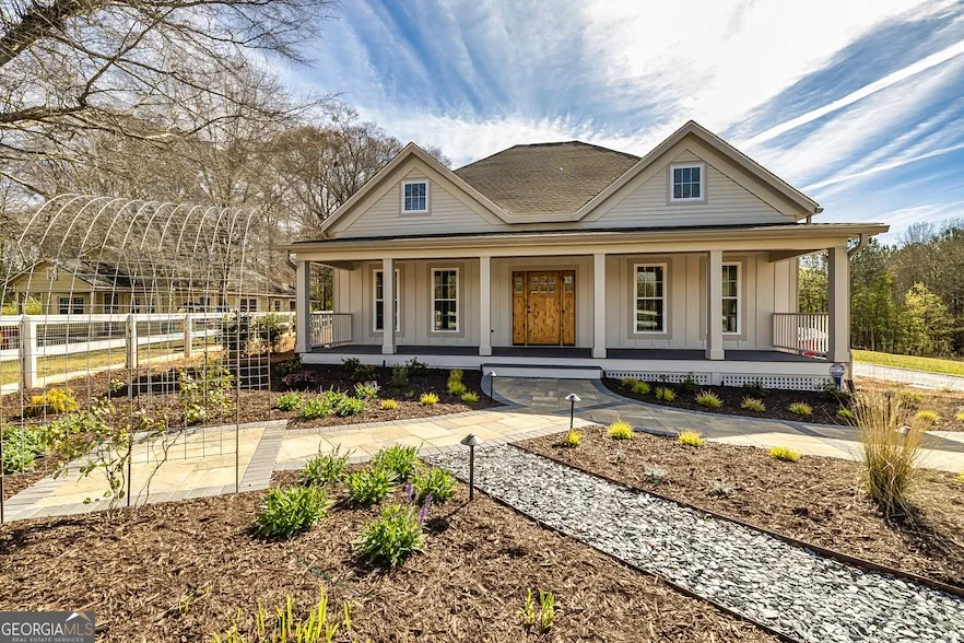 This stunning historic farmhouse has been completely renovated, preserving its timeless charm while offering modern comforts. Nestled on 7.8 fenced and gated acres, this property provides both privacy and potential for additional home sites. Thoughtfully designed landscape lighting enhances the beauty of the home and its upgraded landscaping, creating a warm and inviting ambiance. Step onto the expansive front porch and into a beautifully updated interior featuring an open-concept floor plan with a spacious kitchen and breakfast area-perfect for entertaining. The primary suite on the main level boasts a luxurious upgraded bath and a generous walk-in closet. Two additional bedrooms share a beautifully renovated full bath in the hallway. With top-to-bottom updates, this home seamlessly blends historic character with modern convenience, making it feel like new. Don't miss this rare opportun...