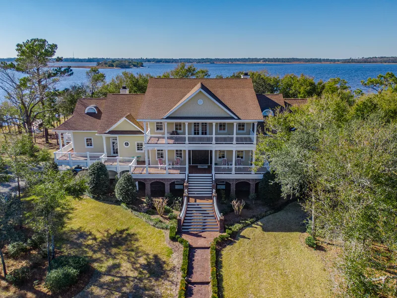 Enjoy ultimate privacy from this gated 7.8 acre river front estate with over 330 feet of water frontage. The luxurious low-country inspired home offers miles of blue water views from the grand living spaces and expansive covered porches. Interior features include 10 foot ceilings throughout the main living level, gleaming random-plank oak floors, 3 fireplaces, and walls of Andersen windows that bring in the magnificent river views. The elevator offers ease of travel to all three levels of the house. Step outside onto the private 200 foot pier and enjoy a day of boating on the Cape Fear River, Intracoastal Waterway or Atlantic Ocean. The boat dock features two boat lifts (12,000 and 18,000 pounds). The gourmet kitchen boasts an oversized granite island with raised walnut bar, custom cabinetry, ice machine, a walk-in pantry with custom tin ceiling, double ovens and Wolf range. The waterfro...