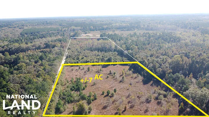 It is simply a gently sloping 7 +/- acres of land with a small intermittent stream as a boundary. Surrounded on 3 sides with large timberland tracts. Can add 7 +/- acres woodland, and or another 7 +/- acres with a mostly complete cabin.