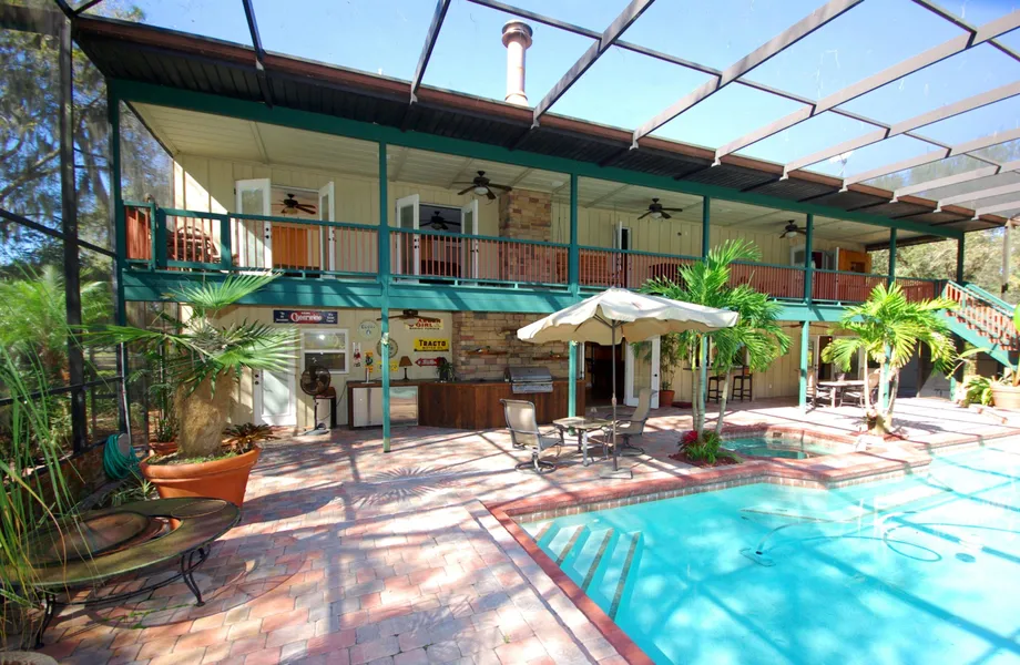 Absolutely spectacular country retreat with guesthouse and 8-stall barn on 7+ acres, located only 30 minutes from Sarasota's beaches and cultural center! This stunning equestrian estate received a COMPLETE MAKEOVER in 2010, when the owner gutted the entire house and rebuilt it, using the finest materials. The most striking feature is the 3500 sq. ft. pavered pool deck, with a 2-story cage. All the second story rooms are connected with a big deck with dramatic views of the grounds and the pool area. A soaring entrance hall leads to the living room, gourmet kitchen (with two breakfast bars), dining room, and pool deck. The open floor plan is great for entertaining many guests, who will also enjoy the summer kitchen, and a real saloon! Downstairs you will also find a guest bedroom, two bathrooms, and a spacious laundry room. The master suite is upstairs, as are two more guest bedrooms and another bathroom. A freestanding building contains a 4-car garage, and a 2/1 guesthouse with a big living room, kitchen, and enclosed porch. The barn is an equestrian dream: all stalls have a fan and water; there is a big office, tackroom, workshop, and an area for shavings. Big overhangs on either side allow you to tack up your horse in the shade. A saddle trail is directly behind the property, and is connected with miles of trails that run through the subdivision. Big oaks and tropical vegetation surround the home and its outbuildings. The grounds are fenced and cross-fenced, creating 5 different pastures. This property can be purchased with its furnishings under separate agreement.