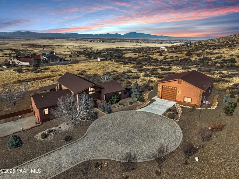Fabulous Panoramic Views, 7 acres fenced and gated! HUGE 40 X 50 RV garage with electric and 1/2 bath, perfect to park the RV and work shop space! The home is AMAZING!! Stunning great room w/Fireplace off the kitchen with HUGE floor to ceiling windows capturing the panoramic views! Real Hardwood floors! Wrap around deck with Views off great room! Main level with Spacious master suite with gas fireplace, and huge walk in closet plus master bath with sep/shower and tub and dual sinks. Jr Suite bed 2 on main level and a 3rd bd on the main level. Lower level finds a great room + 2 more bedrooms, an office, plus excersize room. Private back yard court off patio with built in BBQ kitchenet with sink, and newer 2022 Hot tub with privacy. Don't miss the 2024 Tankless hot water heater cont...