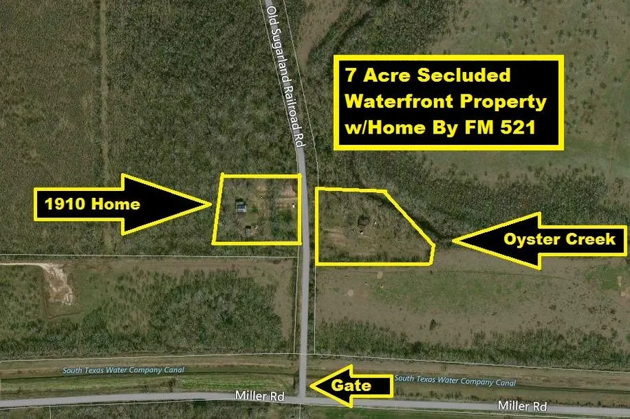 7 Acres on Oyster Creek w/Famous Miller 19th Century Historic Home by FM 521. Secluded! Surrounded by 800 acres of undeveloped land. With Addition in 2005, Home Still Retains Most of Its Original Character. Original Hardwood Floors Upstairs & Laminate Floors Downstairs. Original Wood-Burning Fireplaces. Cypress Wood Exterior. Original Section of Home has Tin Roof. Addition has Composite Roof. Granite Island & Large Windows. Large Barn w/Water. Propane! Mobile Home Hookups. Pecan Grove & Giant Oaks Trees. Sienna Schools! Hunt from Living Room Window! Fish From the Private Banks of Property! Raise Livestock! Close to TX-288. 20 Miles to Richmond & 30 miles to TX Med Center & Downtown Houston! Very Low Taxes! No HOA! Sold As-Is! Can be Commercial, Industrial, Multifamily or Residential! Perfect for Bed & Breakfast, Hunting/Fishing Lodge, Camp Grounds, RV Park, Company Resort, Veterinary Cli...