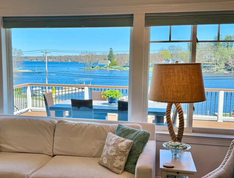 Feel like you're on vacation every day at this Bantam Lake 5BR/3.5B Modern Cape rebuilt in 2012 by master craftsman- including a deeded waterfront parcel with 70' of frontage with a dock. Enjoy vast views of CT's largest natural lake in Litchfield County, also conveying deeded shared use of 50' of beach area. Greet guests as they enter the foyer with a cathedral ceiling and chandelier on an Aladdin lift for cleaning ease. The open floor plan is accented by a fieldstone gas FP in the living room, and dining area with sliders leading to an enclosed 3 season room with a 2nd fieldstone gas FP. Loads of light filter through the large and beautiful choice of Marvin triple pane windows, and native white oak flooring is found in the living room & bedrooms. A chef's kitchen boasts custom hickory cabinetry, quartzite counters & SS high-end appliances, not to mention a Wolf gas cooktop & wall oven. The main floor primary suite with lake views includes a big walk-in closet and a spoil yourself bathroom with tiled shower and jetted soaking tub. Upstairs are 4 bedrooms & 2 full baths. Entertain outdoors on the huge deck with Azec floors and take in all the lake has to offer from sunrises to rainbows. The outdoor shower is great for rinsing off after a fun day at the lake or a vigorous start to your day, and has geothermal heating and cooling system, propane furnace and energy star foam insulation. More extras include an RV pad and automatic home generator. Minutes to the Litchfield Green.
