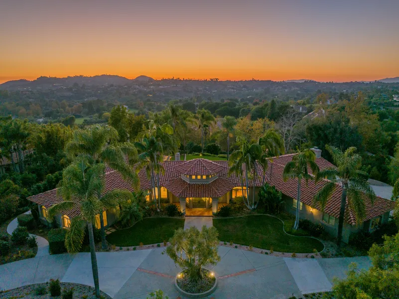 Tucked away in the guard-gated community of Rolling Hills Estates, this Spanish Colonial estate exudes charm and offers breathtaking westerly vistas, alongside exclusive equine amenities. Ensconced in privacy and serenity, the property boasts a private barn with two stalls and direct access to the private horse trails unique to Rolling Hills Estates. The estate's custom design unfolds across a single story, greeting visitors with a circular driveway leading to a grand French door entrance, crowned by a 16 ½ foot foyer featuring wood beams and glass. As you step inside, panoramic windows in the formal living room frame the manicured gardens and the Sleeping Indian formation, perfectly capturing the enchanting Fallbrook sunsets. The sunken living room, with its Kiva fireplace, exposed wood beams, and Saltillo-style tiling, invites warmth and relaxation. The home's south wing houses three bedrooms, two bathrooms, a substantial laundry and mud-room area primed for a future pool or spa, a morning kitchen, and ample storage space. The north wing is the social heart of the estate, encompassing a cozy family room with a gas fireplace, accented by a tongue and groove ceiling with visible beams, along with the kitchen, formal and informal dining areas, and a guest bathroom. All main living areas and the primary suite, open onto a vast patio. The primary bedroom is a retreat in itself, offering panoramic views, a spacious walk-in closet, and an expansive bathroom with a walk-in shower and jacuzzi tub overlooking a secluded garden. The estate extends to a detached guest house featuring 578 square feet of additional living space, complete with a full bathroom and a morning kitchen. The guest house is enveloped by a carefully curated garden of cacti, succulents, and tropical plants. The 2.6-acre grounds also include a two-stall barn, tack room, round pen, wash rack, and direct access to the private horse trails of Rolling Hills. In total, the property encompasses 4,472 square feet of living space, with 3,894 square feet in the main residence and 578 in the guest house, each with their own heating and AC systems to offer 4 bedrooms and 4.5 bathrooms. The oversized 3-car garage features epoxy floors, a workspace, built-in storage, and a utility sink. Rolling Hills Estates is renowned for its beautifully maintained parks, luxury clubhouse, tennis courts, storage facilities for boats and RVs, a pond, and secure gated access, all complemented by a network of equestrian trails meandering through the community. Located in a region celebrated for its avocado and citrus groves, blossoming wine region and charming ambiance, 7 Rolling View Lane enjoys the benefits of a small-town feel with the convenience of being just a short drive from renowned golf courses, equestrian trails, and boutique wineries. The property offers both the seclusion of a gated community and accessibility to major highways, connecting you effortlessly to San Diego's vibrant beaches and cultural hotspots.