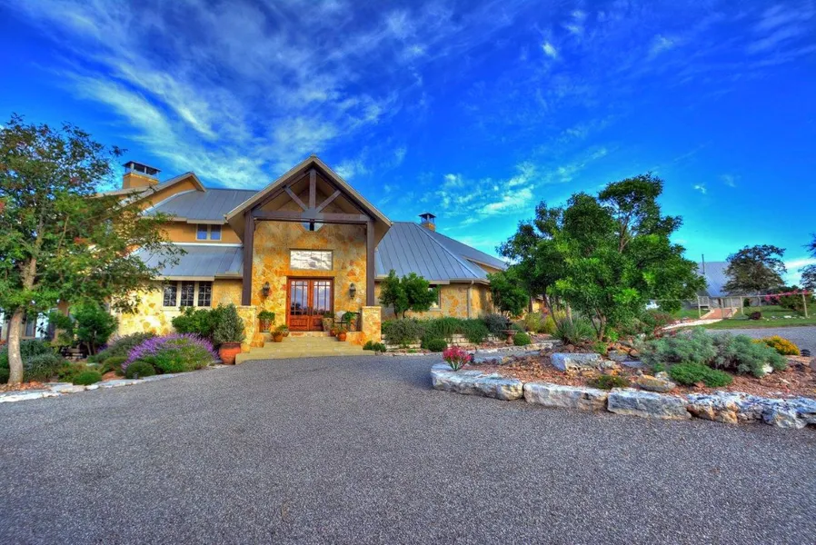 Sprawling ranch w/breathtaking views of TX Hill Country. Private road, separate guest house, infinity pool & heated spa, mature hard woods, enchanting landscape design, greenhouse, barn/corral.70 acre lot w/2 entry gates, perimeter fencing & cross fencing. Bright & airy property w/high ceilings, large windows,3 gas fireplaces, & outside access from almost every room. Central foyer/dining w/stained wood beam ceiling offers easy access to common areas of floor plan. Gourmet kitchen & breakfast room/FP#1,distinctive great room w/floor to ceiling windows & stained wood beam coffered ceiling/FP#2,spacious & private master suite/FP#3. 2 upstairs guest beds w/bath & balcony & executive office. Outdoor kit/gas grill/seating area on covered porch, fire pit. 1400 sq ft. Guest Quarters. Ag Exempt.