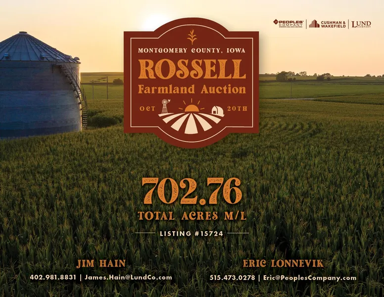 Peoples Company along with the Lund Company are pleased to present the sale of 702.76 acres m/l of high-quality Montgomery County farmland. The Farm will be sold as seven individual tracts through the Multi Parcel Auction Method where tracts can be purchased individually or any combination. Tract sizes range from 1.65 acres m/l to 186.26 acres m/l. The auction will take place Wednesday, October 20th at 2 pm at the Cass County Community Center, 805 W. 10th Street Atlantic, Iowa 50022.