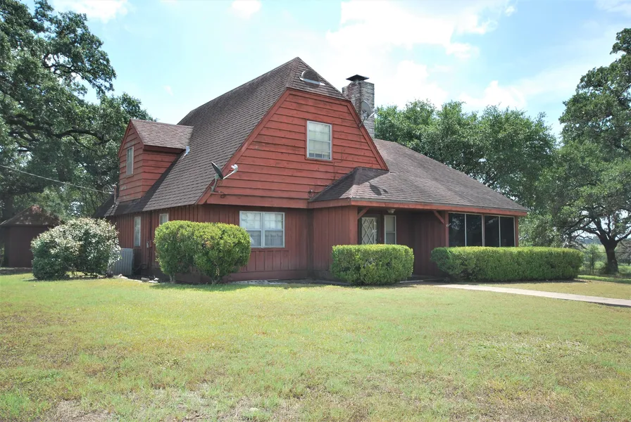 The A framed home sits back off the road and is surrounded by majestic live oaks allowing for privacy and relaxing under the Texas starry nights. The 1.5 story home has been well maintained and has a very large family room which contains large windows on three walls allowing you to view this beautiful country setting. The vaulted beamed ceiling in the main area of the downstairs welcomes you with a rock fireplace. This 4-bedroom, 2 bath home is very comfortable. The first floor has 2 bedrooms, bath with shower, kitchen, dining and two-family areas. The A frame construction extends upstairs into the north bedroom which overlooks the downstairs fireplace area. There are two bedrooms a full bath upstairs and an over-sized closet that is accessible from both bedrooms.