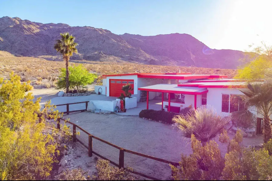 At the end of the road on a peaceful cul-de-sac, this one-of-a-kind desert retreat offers uninterrupted majestic mountain views, and total tranquility. Surrounded by pristine natural landscape and old growth trees it's the perfect escape for those seeking peace, privacy, and that unmistakable desert magic. Start your day with a hike right from your front door, then wind down in the hot tub under the stars. Enjoy quiet mornings on the covered breezeway and cozy evenings by the back patio fire pit. The home's eclectic desert style shines with custom tile work, concrete and tile flooring, vintage wallpaper and designer decor throughout. The well-equipped kitchen includes stylish hardware and artistic touches, while the dining area features a custom wood accent wall. Adding warmth and charm to the living space, the fireplace serves as a stunning focal point with its unique design and cozy presence. Tucked away for maximum privacy, the primary bedroom is a peaceful sanctuary all its own. Separate from the main living space and accessed off the patio for a true retreat feel. Wake up to mountain views and desert light streaming in. Featuring an en-suite bath and styled with warm, eclectic touches, it's the perfect blend of comfort, calm, and charm. The inviting in-house bedroom makes the most of its space with thoughtful design and cozy details featuring stylish decor, great natural light, and easy access to the rest of the home. A perfect little hideaway to rest, recharge, or get inspired. Additional features include: Mini splits for efficient heating & cooling, large laundry room, storage closet, shed, and 2-car garage with built-in cabinetry and workbench. The fenced yard is ideal for furry companions, and the desert landscaping is both beautiful and low maintenance. Whether you're looking for a personal sanctuary or a turnkey short-term rental, this special home is ready for you to move in or Airbnb on day one. Just minutes from Joshua Tree National Park, local shops, and restaurants yet far enough to enjoy total solitude. Furnishings, art, and accessories may be available for purchase outside of escrow.