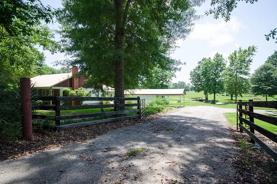 The land is gently rolling, broken by several wet weather branches, and is divided equally among pasture and woodland. The grazing area is divided further into several fenced pastures and smaller feeding pens. The wooded area features mostly maturing pines, with a variety of large native hardwoods located in a creek bottomland. Three ponds are found in the upper open part of the tract including a stocked fishing pond with covered pier and dock near the home site.
