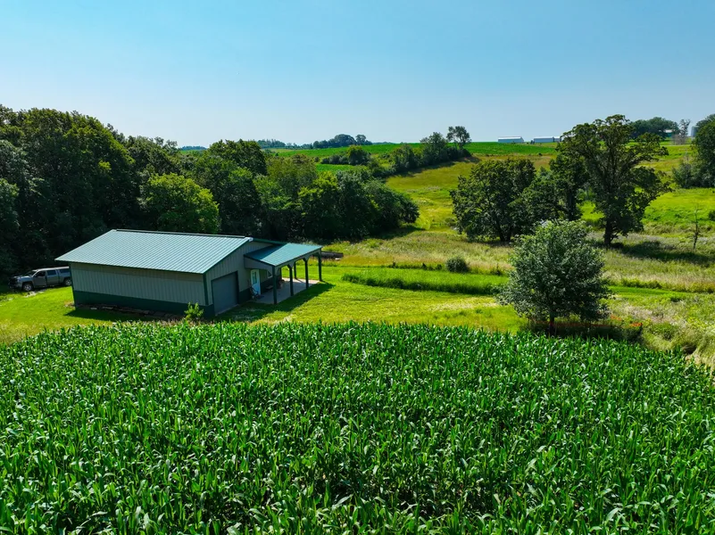 This picturesque blend of fields, woods and pasture is the ideal location for a hobby farm, weekend getaway or the perfect spot for your dream home. There are approximately 71 acres total with 22 acres of rolling cropland, a spring fed pond, 12 acres of grassy pasture and gorgeous stand of mature hardwoods with towering red oak trees. The 40x30 steel building has a concrete floor and electric service offering plenty of room to store equipment and toys. The shed also has a finished, heated/insulated, office/kitchenette area to get out of the elements. Several maintained trails through woods offer vehicular access to most of the ground. The property is home to turkeys, pheasants and deer. The woods are full of rubs and scrapes from this fall and deer were running in every direction the first time I hiked the trails. The timber is interconnected with several larger wooded ridges and valleys...