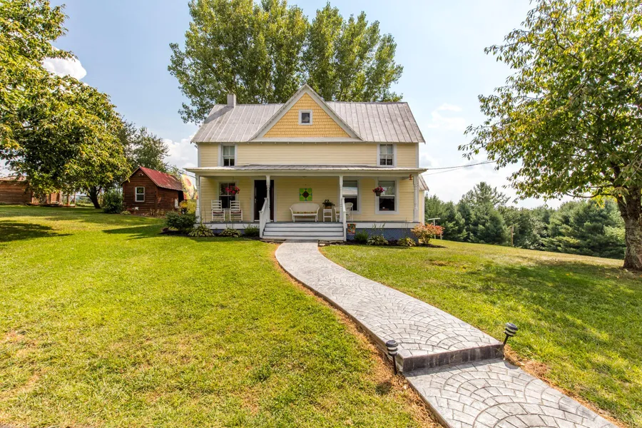 Always dreamed of owning a Mountain home? This charming, substantially renovated old farm house on 5 acres near Galax will impress you with its lovely hill top exposure, rolling green lawns with fruit and nut trees including stables with barns.It has a renovated living room with stone fireplace and wood floors throughout, a large eat-in kitchen with new stainless steel appliances, laundry room, den & office plus 3 bedrooms. A new paved driveway, 2 car garage and multiple covered porches add to the charm & comfort of this home. Easy to show! Call and visit to fall in love!! The original log home was built from cedar logs in the early 1900s and added to around 1935. Plumbing has been ran to the loft area if someone wanted to add a half bath. Home has some replacement windows. The newer barn uses the private well and has electricity and 4 stalls. There is a well house, chicken coop, and wood shed and hay barn. The older barn has electricity, wood stove and stall area. Area around the newer barn is fenced with the no climb fencing. The huge garage has electricity and plenty of storage space or workshop space. Schedule your showing on this mini farm today!