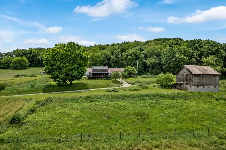 73 Acre Farm with so many possibilities. Restored farmhouse on the property with cherry flooring used from wood on the property, with 2 bed and 2 full bath and first floor laundry with a wraparound porch overlooking the rolling hills and scenery. There is a wood burner to the home with a backup propane furnace. There are approximately 31 acres of beautiful woods full of wildlife and oak, cherry, maple, hardwood, elm and walnut trees. Last timbered approximately 40 years ago. Two acres of home and outbuildings, 9 1/2 acres of pasture, and 30 acres of farmland (crops). There is a 136 x 32 (with own electric service) Garage/outbuilding with Electric. 40 x 80 Pole Barn, 20 x 20 Detached Garage, and a 40 x 60 Bank barn with 3/4 stalls, and 2 wells and own electric service panel to supply the livestock. There is fenced area of pasture and had an outdoor arena and round pen. The property offers...