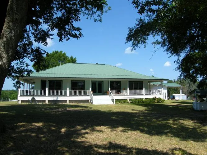 A working 72-acre cattle ranch with a beautiful "Southern Living" home, plus a pretty brick foreman's house (or rental) at front gate, with 2 lakes, huge workshop, barns, corrals, stable and more. Back boundary is Billum's Creek, lovely sand-bottomed creek where once an Indian village was sited; artifacts still being found there; abundant wildlife. Secluded open concept main home features wraparound porch, rooftop viewing deck, split bedroom plan. Wood planked floor, massive oaken fireplace, island kitchen with solid-surface countertops and lots of custom cabinetry, adjacent dining room and large utility room. Panoramic views from every room in the house. Master wing has french doors to porch and ensuite bath with multi-head shower and fabulous closet. Guest bedroom wing has 2 bedrooms with hollywood bath. Three-car garage/workshop with half bath, with large attached RV-port, plus huge...