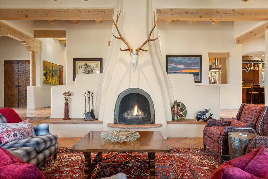 Gazing out over the Eastside toward the majestic mountains in the west, this classic Pueblo-style retreat is suffused with a warm, welcoming ambience and Southwestern elegance. Hand-plastered walls, vigas, latillas, kiva fireplaces, and wood and Saltillo tile flooring contribute to the sophisticated aesthetic, and the spacious but comfortable rooms are ideal for festive entertaining or private relaxation. Highlights of the 5,125-square-foot floor plan include a well-equipped kitchen and family room, courtyards with comforting water features, portales encouraging outdoor enjoyment, well-separated bedroom suites, and a restful guest casita. Located in a gated area of paved roads just above St. John's College and just steps from hiking trails and the Santa Fe National Forest, the property is easily accessed yet utterly peaceful.