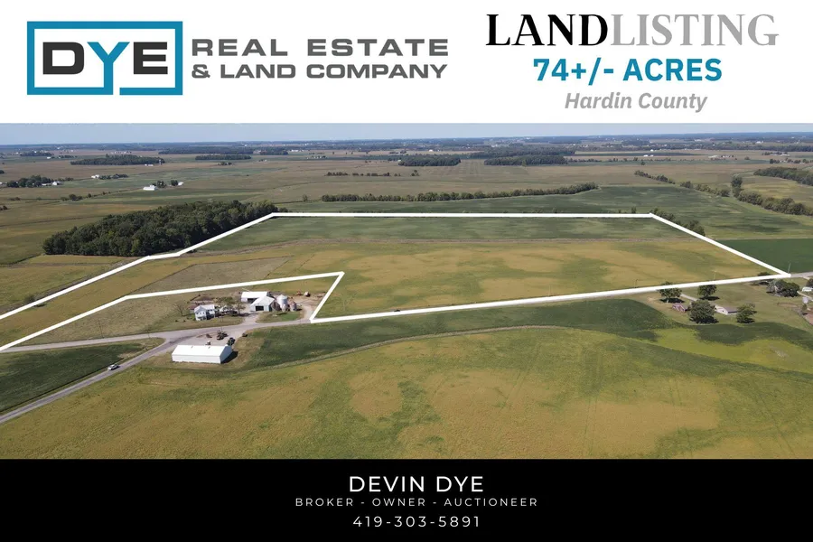 74 +/- acres of primarily all tillable farmland in Hardin County. Located just west of Kenton Ohio. Soil consists primarily of Pewamo and Blount; it has excellent soil types for the area with a rating of 70.09. Great outlets for drainage are available. Dont miss this opportunity.