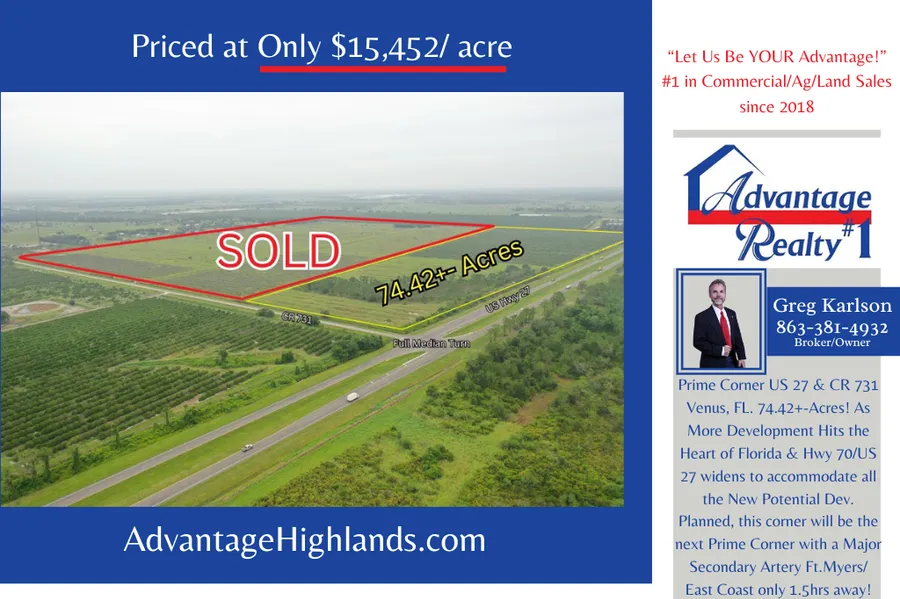 Prime Corner US 27 & CR 731 Venus, FL. 74.42+-Acres! As More & More Development Hits the Heart of Florida and Hwy 70/US 27 widens to accommodate all the New Potential Developments Planned, this corner will be the next Prime Corner with a Major Secondary Artery Ft.Myers/ East Coast only 1.5hrs away! This community is also the closest rural prime gettaway location for Miami/ South Florida Ranches & Equestrian Recreational Real Estate Connoisseur's.