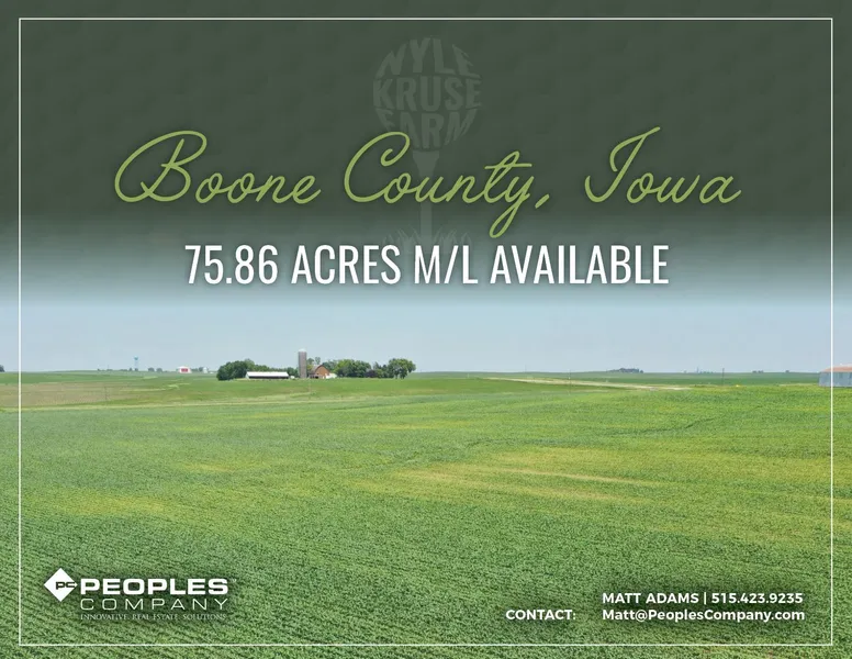 A long-time family heirloom of the Kruse Family is being made available for sale to the public. Peoples Company is representing the sale of 75.86 acres m/l located four miles south of the town of Boxholm within northwest Boone County, Iowa. The farmland consists of 73.76 FSA tillable acres with a CSR2 soil rating of 76.6. There are several competing grain marketing options located nearby including ethanol plants located in Gowrie, Grand Junction, and Coon Rapids and a variety of grain elevators. Great access to the surrounding area with location along US Highway 169.