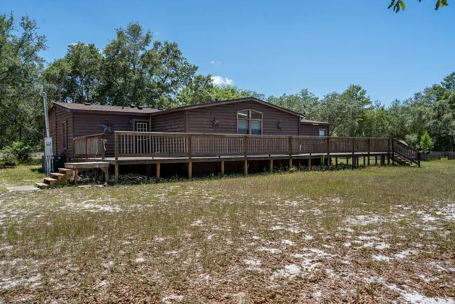 5 fenced high and dry acres of peace and quiet in the country with a 5/3 log manufactured home and a BRAND-NEW ROOF IN MAY 2020. Inside, wide open spaces and volume ceilings separate the split floor plan and are accentuated by the newer wood-look vinyl flooring, wood-burning fireplace and doors leading to the 16 X 30 screened rear porch. The 25 X 13 kitchen features an abundance of natural lighting and more cabinets and counterspace than you can imagine! The master suite features a walk-in closet, step-in shower, garden tub and dual vanities and two other bedrooms also include walk-in closets. While this home does need some finishing touches of TLC, it is well priced for this much home and land. Outside, the front-facing wooden deck runs the entire length of the home and is the perfect place for enjoying the star-lit evening skies. Got animals? If so, you may appreciate the hen house or the three separate paddocks, which are perfect for grazing or just roaming the landscape, which is mostly cleared except for a good mix of majestic Live Oaks. As for the link to the 360-degree virtual tour. All measurements are approximate and should be independently verified.