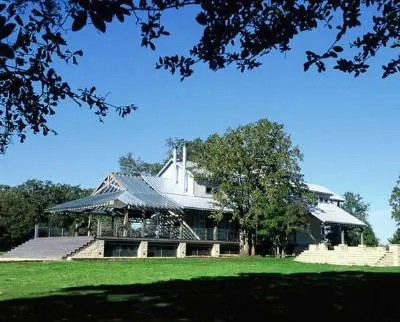 Travel down a long gravel road to a magnificently designed farmhouse perfectly situated at the edge of a meadow with a large pond on the opposite side. This home is a fusion of regional residential, industrial and agricultural elements and forms, constructed mainly of galvanized steel and limestone for low maintenance and durability and built up on a platform . The house with large porches on three sides, looks like a long sophisticated shed floating on the meadow.
