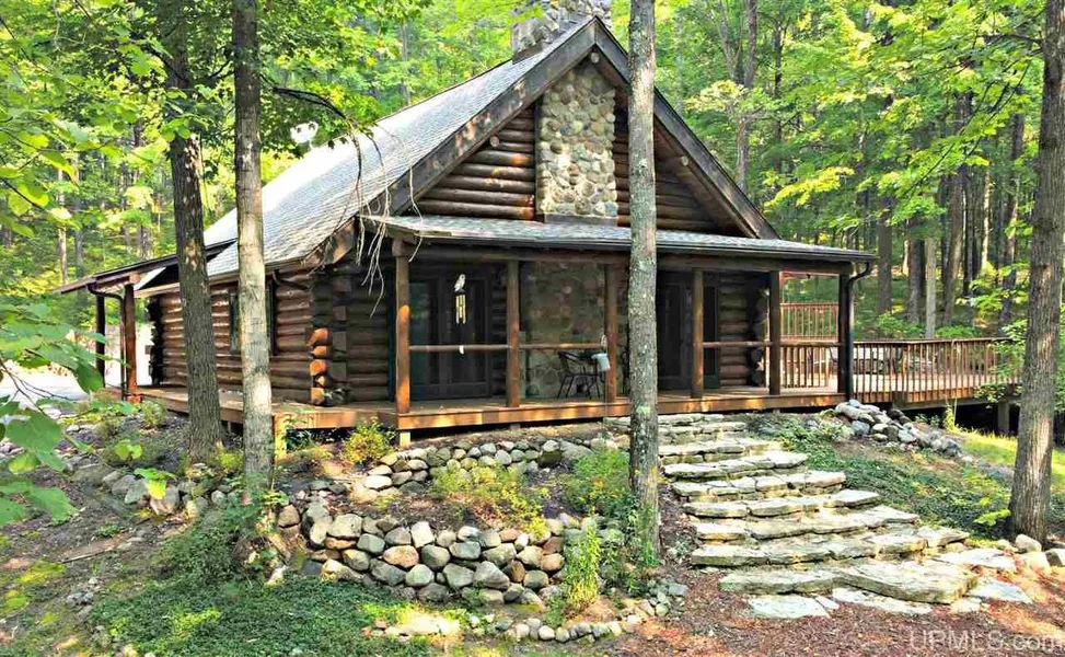 Full Log Home built on a hillside amongst 77 acres of hardwoods and pines that meld down to Holmes Creek, a Class 1 Trout Stream flowing thru the south parcel. The north parcel has rolling hills with wildflower fields, apple trees, spring fed pond and a Quarry that doubles as a personal shooting range. The Fieldstone Fireplace has a dome heat reclaimer and blower unit. Tongue and groove pine walls are notched into log walls for a lasting fit. Half Loft can be extended over kitchen Relax in your personal Sauna or on the 3-tier Cedar Deck with fire pit. Barn Style 2 car garage with loft.