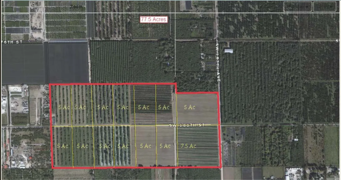 77.5 Acres already divided into 5 Acre Tracts. Prime Location on paved SW 187th Avenue. Property is in grove and row crops. Has its agricultural exemption and low real estate taxes.Hard to find 77.5 acres available for private ranch/estate only. Only one (1) mile from four (4) lane interstate, Krome Ave. Great opportunity for a secluded residence within a thirty minute drive from all restaurants and splendor Miami has to offer. Zoned agricultural. Great investment opportunity. Vacant land.