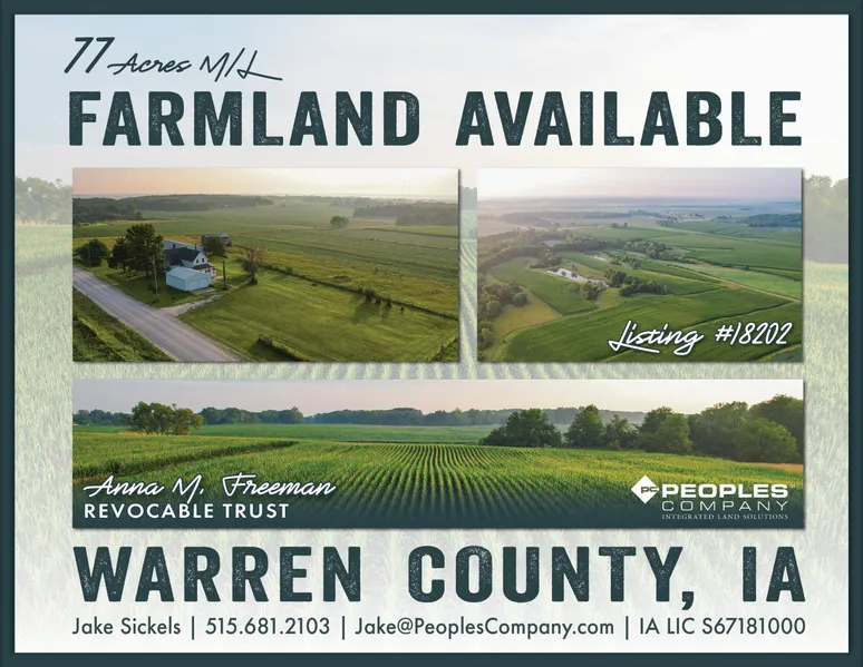 Peoples Company is pleased to represent the Anna M. Freeman Revocable Trust in the sale of 77 acres m/l and a farmhouse, located just north of Hartford in Warren County, Iowa. The property consists of premium tillable land, hay ground, scenic ponds, an early-1900s farmhouse in good condition, and various usable outbuildings.