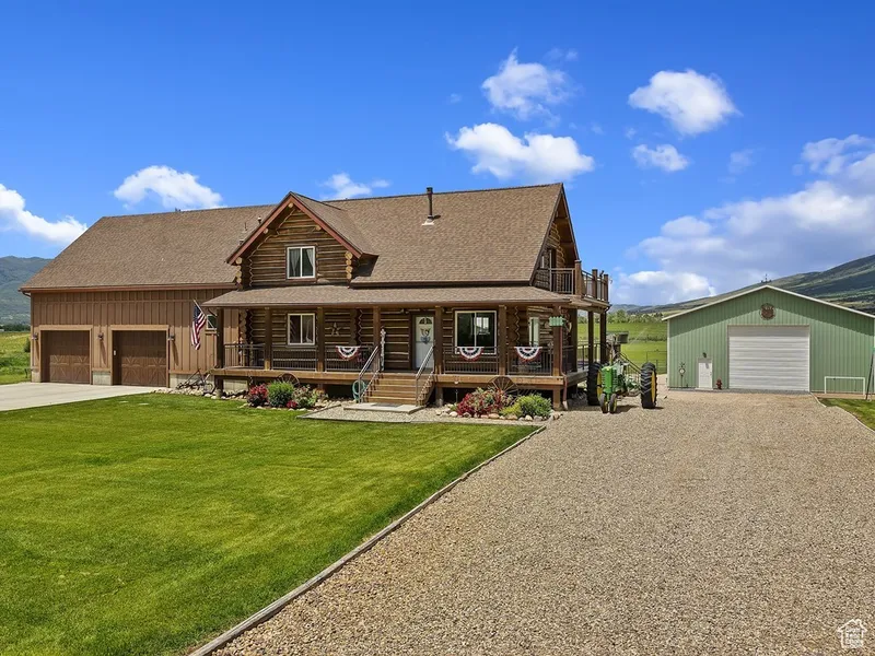Welcome to this stunning home that combines rustic charm with modern amenities. This 4-bedroom, 3.5-bathroom residence is a true haven for those seeking a blend of comfort and outdoor living. As you step onto the wrap-around porch, envision yourself enjoying serene moments or entertaining guests on the expansive deck and covered patio. The log home exudes warmth, featuring 2 fireplaces and boasting 2 laundry rooms for added convenience. The heart of this home is the well-appointed kitchen, complete with double ovens and a large pantry, catering to culinary enthusiasts. The spacious primary bedroom offers a tranquil retreat with an en-suite bath and a walk-in closet. For those with equestrian interests, this property is a dream come true. Situated on horse-friendly acreage, the horse barn includes four stalls, hay storage, and convenient drive-in and out doors. Additionally, a 2400 sq ft shop with 14X 16 drive-through doors provides ample space for various uses. Noteworthy features include a Generac 22KW generator that powers the entire property house, well, and shop, ensuring uninterrupted comfort. Located just minutes away from Snow Basin, Powder Mountain Ski Resort, and Pineview Reservoir, this property offers access to world-class skiing in the winter and a myriad of outdoor activities year-round, including hiking, biking, fishing, and horseback riding. Seize the opportunity to own a piece of paradise that seamlessly combines luxury living with the allure of nature. Schedule a showing today and explore the endless possibilities that await you at this amazing property.