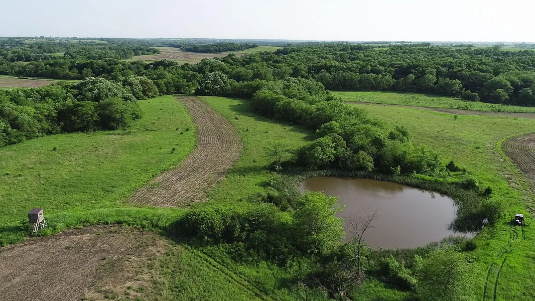This farm is a whitetail hunter's dream, and has already been set up for the new buyer. The food plots are planted to standing grain, providing some income if desired, or the perfect late season setup. A tower blind located adjacent to the large pond, and CRP overlooks a long narrow plot, creating the perfect ambush location. As a bonus, an access point, shown as a teal colored line on the aerial photo, provides access to the North part of the farm for hunting on South winds. If Whitetails aren't your game, turkey and pheasant are also plentiful on this piece, and with the CRP income, the farm would be one of few properties that hunt great and have a good return.