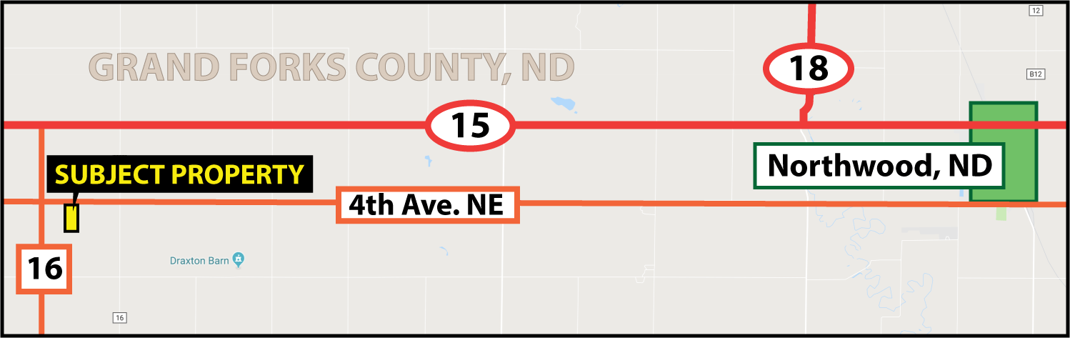 Research Parcel InformationFrom the intersection of Hwy. #15 and Hwy. #18 west of Northwood, ND proceed ten miles west on Hwy. #15, then one mile south on CR #16 and mile east on 4th Ave. NE to the NW corner of the property.