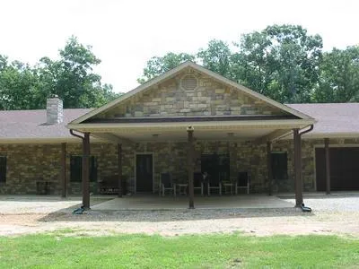 Exterior finished with awesome fabricated rock! 9' wide covered porch surrounds entire home. Porch ceiing finished with aluminum, maintenence free siding. Covered 24 X 20 lighted portico extends beyond the front entry. Perfect place for shaded entertaining!