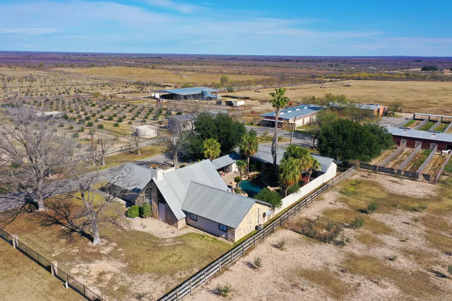 Improvements: The handsome main home is highlighted by a Great Room with Saltillo tile floors, stone accent walls integrating a fireplace, and exposed timber beams and trusses in a wood lined ceiling. One end features casual dining and a sunken wet bar. The home includes 3 bedrooms/ 3.5 bathrooms, kitchen with stainless steel appliances and glass cooktop, formal dining room, and utility room. Through sliding glass doors off the living room is an inviting pool with natural rock scape edging integrating waterfalls and a hot tub. The other side of the pool from the main house includes 4 guest casitas each with their own bathrooms. A short walk from the main house is a 3 bedroom/ 2 bath nice modular home currently being used as a foreman's house. The main horse barn has an office, maid station, 4 horse stalls with connected outdoor runs and plenty of storage space. There is an option to add 4 portable horse stalls to the main barn which would make a total of 8. A second horse barn has 8 stalls each having their own fenced runs. Also at the headquarters is an equipment barn with a shop and connected apartment. Other improvements on the property include 2 large hay barns, 2 modular homes, several storage buildings and 2 rental houses.