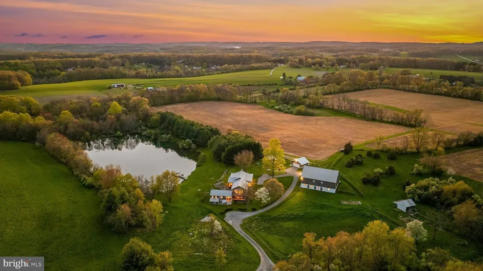 Welcome to "Hickory Farm" a charming property that offers a tranquil and picturesque setting nestled on just under 80 acres of rolling farmland, mature trees and abundant wildlife. As you enter through the gated property and drive down the long winding driveway you'll be greeted by the enchanting sight of a totally renovated contemporary farmhouse with a wrap-around porch that seamlessly blends modern amenities with rustic charm. Upon entering the main level you'll be greeted by the spacious great room, kitchen and living area. The centerpiece of the room is the floor-to-ceiling stone fireplace and the abundance of windows which fills the room with natural light creating an atmosphere of warmth and comfort. This space is great for entertaining and offers spectacular views of the 3.5 acre pond. Also, on the main level is the primary bedroom suite with a side balcony for you to enjoy your morning coffee. The lower level has additional living space with the original stone foundation adding a rustic touch to the family room, bar and another bath and bedroom with a side porch. Step outside the lower level and you'll discover another 2 story structure. This space could provide a unique and versatile use such as a guest cottage or home office, just use your imagination and creative ideas. In addition to the house there are a few more outbuildings. There is a detached two car garage that has been transformed into a man's cave, complete with a mini-split system for climate control, so you can store farm equipment or extra room to hang out. The 66' x 42 post & beam bank barn with 5+ stalls offers the perfect opportunity for equestrian enthusiasts or housing small farm animals. There is also a small wood shed and the open pavilion by the house. The house uses geo thermal for HVAC and additional updates are the full house generator, significantly upgraded Cable, Internet and WiFi and security features such as surveillance cameras, alarm system, the remote controlled main gate. The pond has a new overflow drain, 4 diffuser aeration system and is completely stocked with small & large mouth bass. It is important to note that this property is protected by a conservation easement and participates in an agricultural land preservation program. This ensures that the land cannot be subdivided and has been maintained by the same farmer for many years, preserving its natural beauty and agricultural heritage. Overall, this property is a blend of historical charm, contemporary design and breathtaking surroundings offering a unique lifestyle to embrace a peaceful place to relax, connect with nature and rejuvenate.